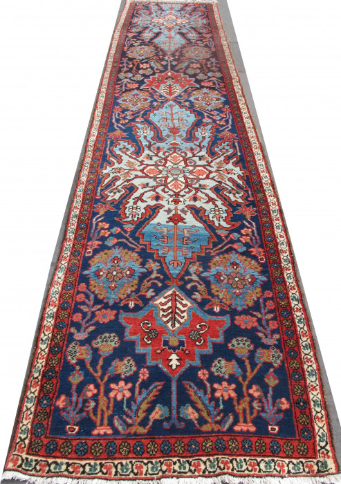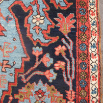 This is striking Persian runner from the Sultanabad district in West Persia. The design is dominated by two dramatically drawn medallions in a lovely sky-blue on a sapphire background. The medallions are surrounded by stylised palmettes and plants drawn in a charming angular manner. The design is freely drawn, displaying the weaver's artistic skills. This is a visual feast, and is a demonstration of Persian village weaving at its best. The materials, handspun wool and natural dyes, are excellent. Furthermore the size is excellent, exceptionally narrow for a piece of this length. Cherished through the generations, it has survived in excellent condition. Professionally cleaned in our workshops, it is ready for immediate use.