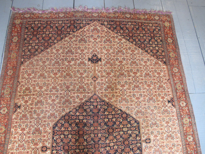 19th century Senneh rugs come in a variety of qualities. This wonderful piece is at the top of the range. Woven on a silk foundation, it is very finely knotted in local Kurdistan wool and then clipped down to a low velvety pile. The dyes are exquisite, particularly the terracotta, greens, yellows and sapphire blue, and are all derived from natural sources. The classic Herati design with a central medallion is beautifully rendered, crisply defined and very easy on the eye. Likewise the main border with a repeating palmette and meandering vine design. This rug is an exceptional example of the group. In very good condition, and retains the original silk selvages.