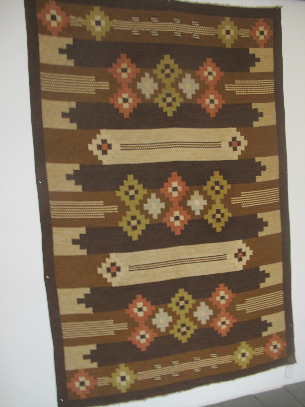 Another wool kilim designed by Ingegerd Silow. Once again we see simple geometric forms that have come together to form a harmonious design. While the design may somehow been influenced by antique Anatolian kilims from Turkey, on this occasion the palette is very much 'Swedish' and would appear to have been influenced by contemporaneous Scandinavian furniture design. Note also the squarish format, again influenced by European homes. This is a very stylish and elegant piece which would work very well in modern decorative settings. Silow's monogram appears in the bottom right hand corner.