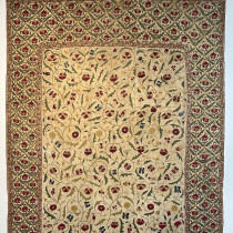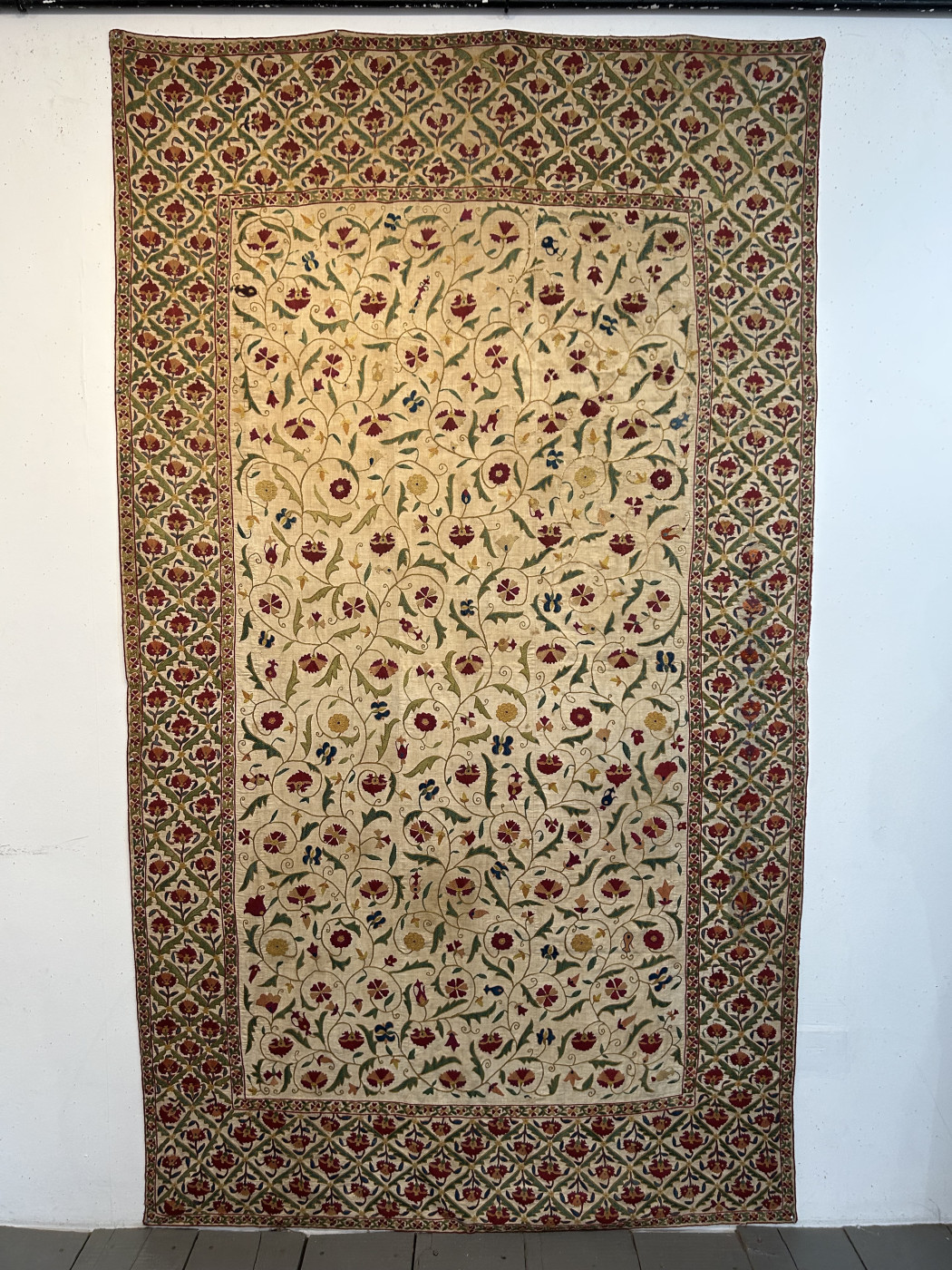 A lovely suzani with delicate colours and an astonishingly beautiful design. The field design flows in a graceful way in an upward direction which contasts with the rigid formality of the border. Lovely delicate colours, especially a selection of greens. Note the gold outlining to the ornaments. Despite areas of loss, this is both a collectible highly decorative piece.