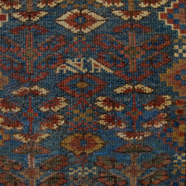 The wool quality and weave suggest this rug was produced the Sauj Bulagh Kurds. The design of repeating shrubs is also associated with this group. However, the format is quite unusual, and has resulted in a very attractive and decorative short runner with a narrow width. The colours are subtle and harmonious. I particularly like the combination of blue and gold. Note also the appearance of a lovely aubergine which suggests a production date no later than around 1870. Generally good condition. One small repair to a corner. Professionally cleaned.