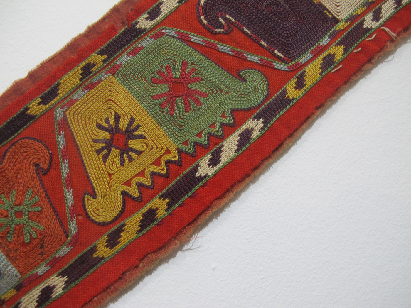 This is a beautiful piece of Lakai embroidery from Uzbekistan dating to the end of the 19th century. Worked in coloured silks on a red plain weave background, it was probably made originally as part of a robe or clothing. All the dyes appear to be natural. Kaleidoscopic yet serene at the same time. In generally good condition. Orginal lining intact.