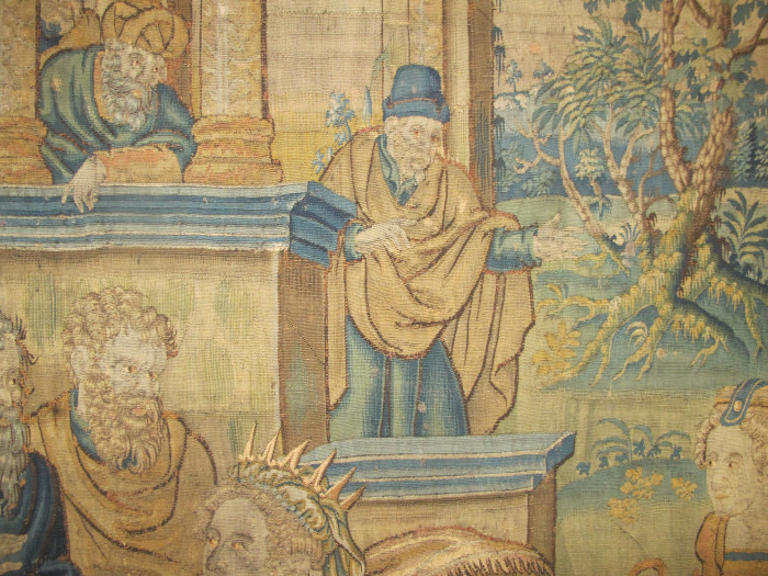 Woven in the famous Oudenaarde workshops in Flanders towards the end of this 16th century, this wonderful tapestry depicts the famous Biblical scene when the Queen of Sheba presents her gifts to King Solomon. The are surrounded by courtiers and the Queen of Sheba's maidens, but perhaps most interestingly by a group of travelers on camels in the top right corner of the field. To the right is a view of a palace with more courtiers.. Note the fine drawing of the costumes. The lovely golds greens and blues are typical of the palette of the period. All this is framed by a striking border of flowers, clusters of fruit and birds. This magnificent piece has survived in very respectable condition for its great age. It has recently been professionally cleaned and is ready for immediate hanging where it will make a highly dramatic impact.