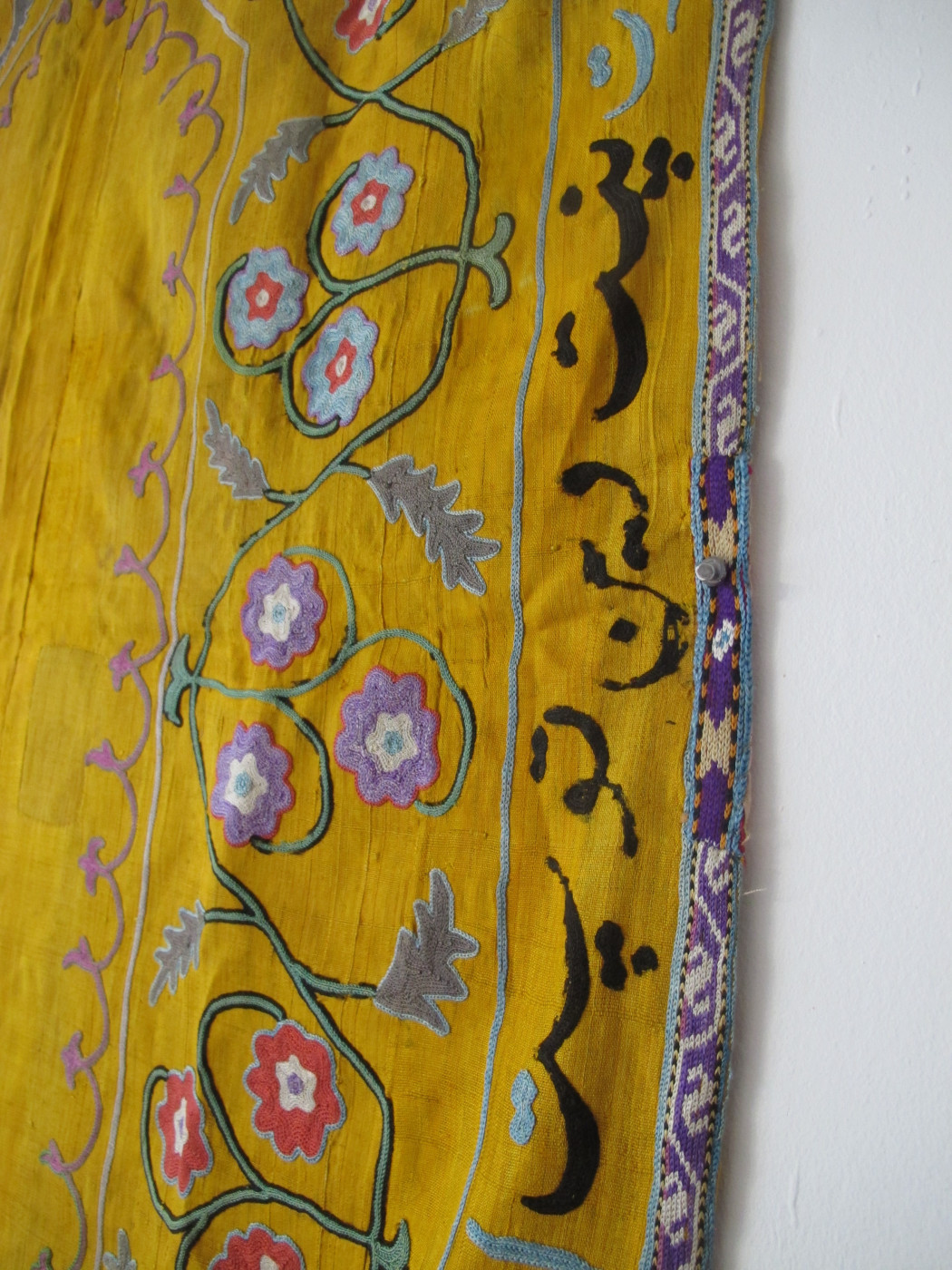 Embroidered on a saffron yellow silk background, this pretty suzani has an elegantly drawn floral border and niche, while the field is undecorated. This format is often mistaken for a prayer design, but it is more likely to be an decorative architectural device, to be used as a room divider, or over a doorway or possibly a mirror. Note the charming calligraphy in the borders. One could imagine this piece working well in many settings, both traditional and contemporary. Lined with a beautiful Russian chintz.