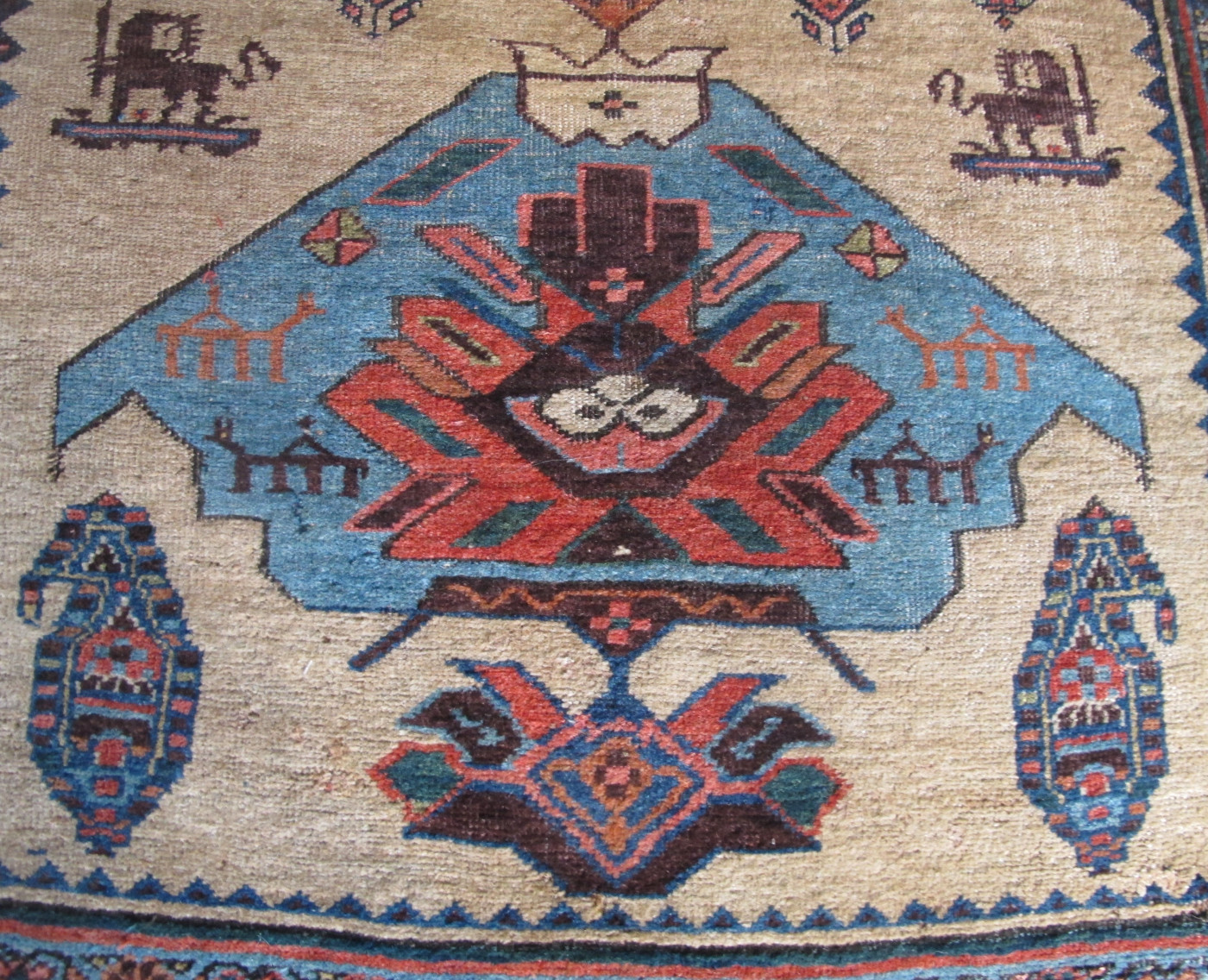 Although ostensibly this striking rug resembles late 19th century Bidjar weaving, the graphics are clearly inspired by earlier Kurdish rugs and in all likelihood it was woven by Kurdish weavers. It has an all wool foundation and a wonderful range of colours, including the a lovely light blue, terracotta, and the undyed camel's hair in the field. The ornamentation is archaic and dramatic, and includes Persian lions, camels, eagle style medallions and single botehs. It is a feast for the eyes. The field is framed by an elegantly drawn repeating floral border in lovely shades of terracotta and light blue. It is a truly charismatic rug and the height of Persian village weaving. This rug has survived in good condition. There is some abrasion to the pile and the selvages have been restored in places. Professionally cleaned.