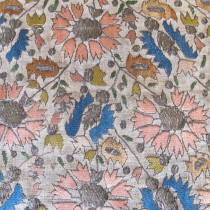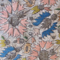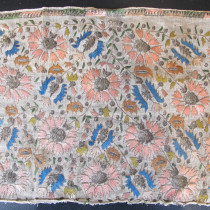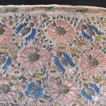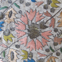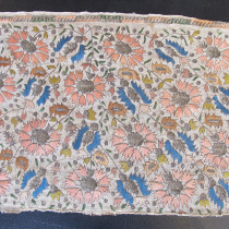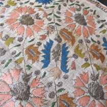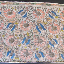 Dating to around 1800, this lovely item is composed of three skirts from embroidered towels which have been sewn together to create a highly decorative panel. The designs across the three panels appear to be very similar suggesting they came from a matching pair. Embroidered delicately in silk on a fine linen background in delicate shades of pale blue, pink and olive green, combined with generous use of silver thread, the floral design flows elegantly creating a lovely calm ambience. In very usable condition. Ideal for mounting and hanging