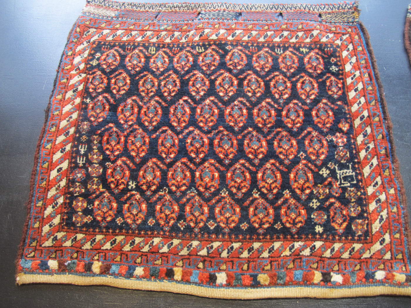 Attributing this pair of Persian tribal bags was tricky. The symmetric knot and stylistic details suggested that they may have been woven by Kurds in the Veramin area of Central Persia. However, I finally settled on the Luri from southern Persia. They have wonderful hand spun wool and natural dyes. The design is lovely, rows of botehs with several filler ornaments, including stylised animals and geometric figures. Very pretty borders. These bags are very collectible, but would also make great decoration. The dimensions are 68cm x 60cm, 66cm x 59cm.