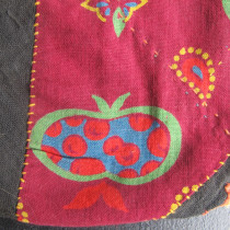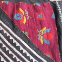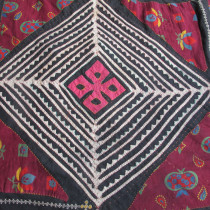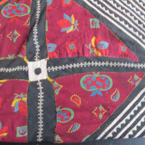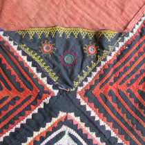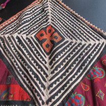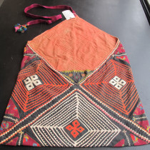 Multiple techniques have been used to create this extraordinary storage bag. Patches of printed cotton have been appliqued alongside some embroidered areas on a cotton background. The result is quite dazzling. Note the long purple wool strap at the top and the mirrors,including the tiny beaded mirror at the tip of the covering flap, amulets to ward off the evil eye. Most likely made by Tadjik tribal woven. Excellent original condition. This is a rare and very collectible Central Asian artifact.