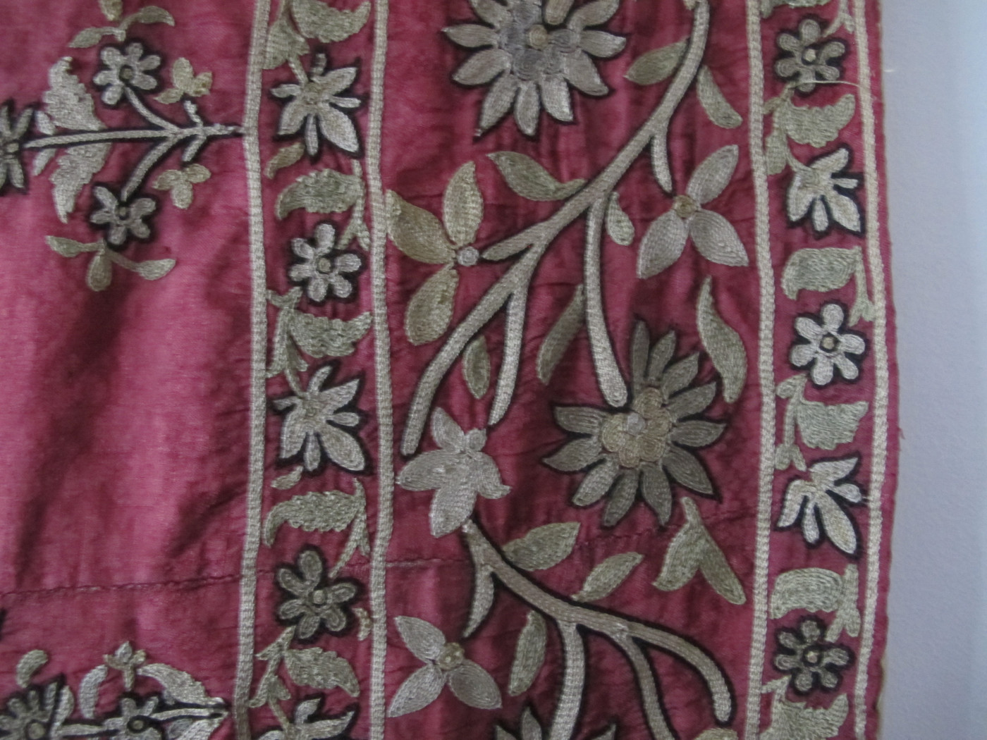 This intriguing beauty had me baffled as to its origin, but I have finally settled for an India but probably made for the Persian market. Woven on a fuchsia silk damask background, the teardrop medallion surround by flowers and birds is very much in the Persian decorative style. Note too the flowing movement of the flowers and tendrils in the border on the same fuchsia background, that completes the delightful composition. The spacing is so elegant and restrained, and the little birds perched on the tip of the flowers is a lovely touch. Ideal for the wall or table. Very good condition. Lined.