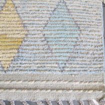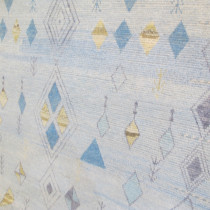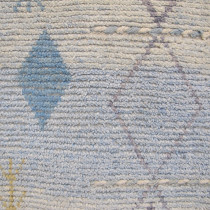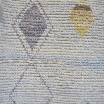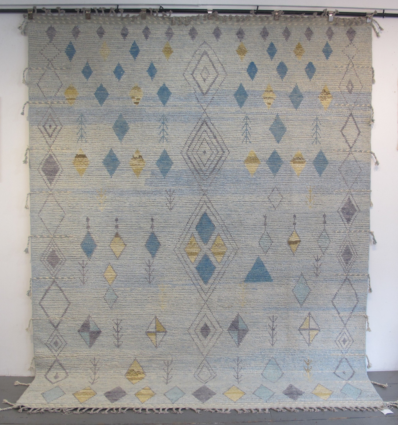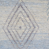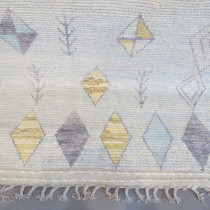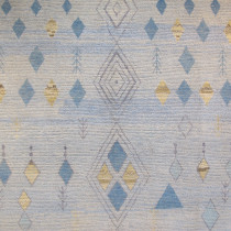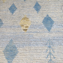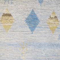 The colour combination of this contemporary wool carpet has instant appeal. The pale blue field has gentle abrashes which create a sense of movement, while the golds and mid-blues add a reassuring sense of tonal harmony. The design which is composed of randomly spaced diamonds in different formats and sizes is playful and easy on the eye. Note the elaborately woven kilim ends and the interesting hand-twisted tassels along the edges. Technically, this is a well-made piece. The wool quality is soft and clipped low which enhances the definition to and clarity of the design. It is a charming carpet which one can see working in any number of contemporary settings either as a centrepiece or as a subtle addition to a modern decorative scheme. Hand-made in Afghanistan.