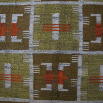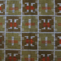 Woven with soft wool in the interlocking tapestry technique, this lovely piece is one of a group of Central European tapestries that were designed to work with contemporaneous furniture which are now very much in vogue with interior designers. The combination of earthy autumnal colours and abstract geometric ornamentation is very attractive and highly decorative. One could imagine this piece is any number of modern settings. Interestingly, it has rings to the back which suggests that it was hanging up along its horizontal axis! Whether landscape or portrait format, on the wall or floor, this great piece would add character and style to modern settings. Note also that this group are still at affordable price levels, but the trend is most definitely upwards.