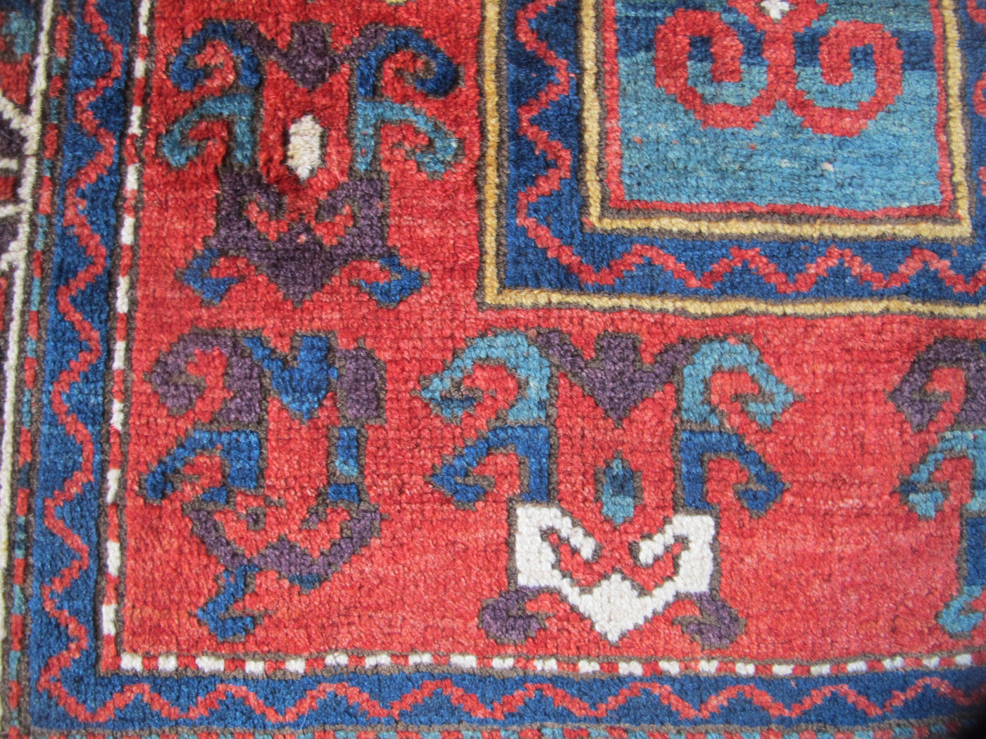 This sparkling Fachrolo rug reveals the best in Caucasian rugs. The dyes and graphics are simply sensational. The abrashed green field is centred by the classic Fachrolo medallion and is surrounded by numerous boxes containing archaic geometric ornaments. There is a further outer field in a lovely abrashed terracotta with more geometric ornamentation. Note the generous use of a lovely aubergine dye throughout the rug which dates it to 1870 or earlier. A subtle feature of the composition is that the field design is ostensibly in the prayer or architectural format with a niche at the bottom and top. All this action is framed by crisply drawn 'wine glass and calyx leaf' border on an ivory background. The weave is unusually fine for a rug of this type, and the pile is clipped low. It is fair to say that this piece, although of tribal inspiration, was probably woven in a workshop servicing Russian or Persian clientele. Furthermore, it has survived in very good condition with only minor signs of wear. Minimal restoration. Professionally cleaned.