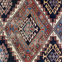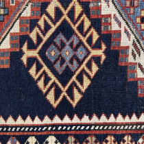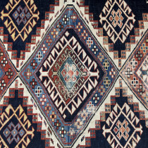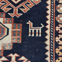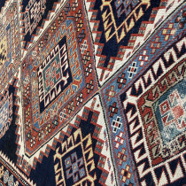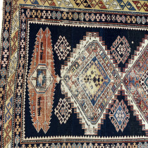 Dating to the last quarter of the 19th century, this is a lovely Karagashli Shirvan from the Eastern Caucasus. It is finely knotted with soft velvety wool and a wonderful range of natural dyes. The field design is familiar, a row of linked lozenges on a glowing sapphire blue background with fan-like anchors at each end of the field. It is beautifully drawn with additional hooked diamonds in each lozenge. The anchors are also interesting containing stylised animals. Note too the lovely borders, in particular the pale yellow main geometric border, and the charming guard stripes with rows of octagons..It is a classic Karagashli Shirvan composition. However, the size is quite special as it is neither the ubiquitous long rug or kellei format one often sees, nor a small rug which one occasionally sees. All these factors make it as a really lovely example. I have priced this rug very sensibly as there is some wear through the centre of the rug which I have chosen to leave untouched to avoid spoiling the character of the rug. Note that the borders, ends and selvages are in very good condition, and it has been professionally cleaned.