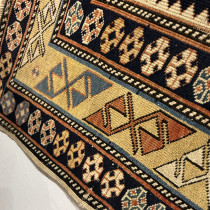 The luminous colours and distinctive fan-like ornaments at each end of the repeat linked lozenges in the field identify this lovely rug as from the Karagashli Shirvan group woven in the Eastern Caucasus. Each lozenge contains further geometric ornamentation while the end panels include stylised quadrupeds. Other hooked lozenges and stylised animals fill the remaining spaces on the glowing sapphire blue field. Note too the dramatic borders. The pale yellow main border is filled with a repeat geometric design and is framed by two narrow guards decorated with colourful polygons. It is a joyful composition which is enhanced by the lovely colouring. Finely knotted with a thin low clipped pile which sharpens the design. The overall condition is good, with original ends and selvages intact. There are some wear through the centre of the rug which we have stabilised and conserved. Professionally cleaned. This beautiful and collectible rug has been priced sensibly to reflect the condition.