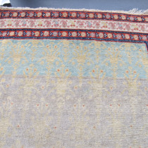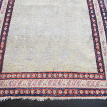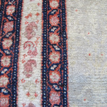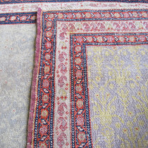 This is a really rare pair of small Senneh rugs. Very finely knotted and clipped low with typically grainy Senneh wool, the aquamarine coloring and faded abstract design are extremely attractive and decorative. Note too the fine detail of the botehs in the borders. The fact that they are an intact pair makes them them very appealing as bedside rugs. Clean and in good condition.