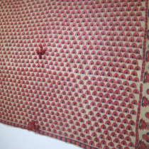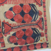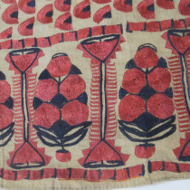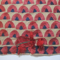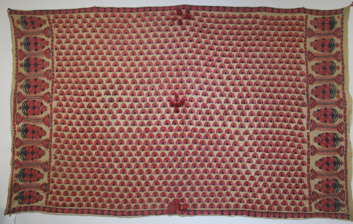 This wonderful textile from Sindh province, Pakistan, is embroidered with fine silk in shades of fuchsia and grey. The field design is composed of repeating demi-lunes or half-moons, a potent symbol of transition between light and dark or perhaps between potential and growth. Note too the delightful rows of shrubs in the side panels, and the little baubles added to the embroidery in places. Remarkably, this piece has survived in excellent condition. One can imagine it being used as a shawl, as wall art or as an exciting decorative furnishing. Professionally cleaned.