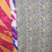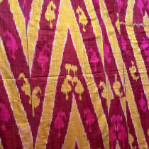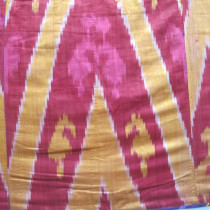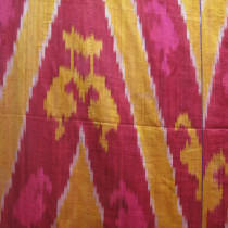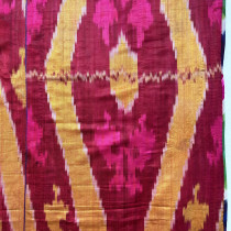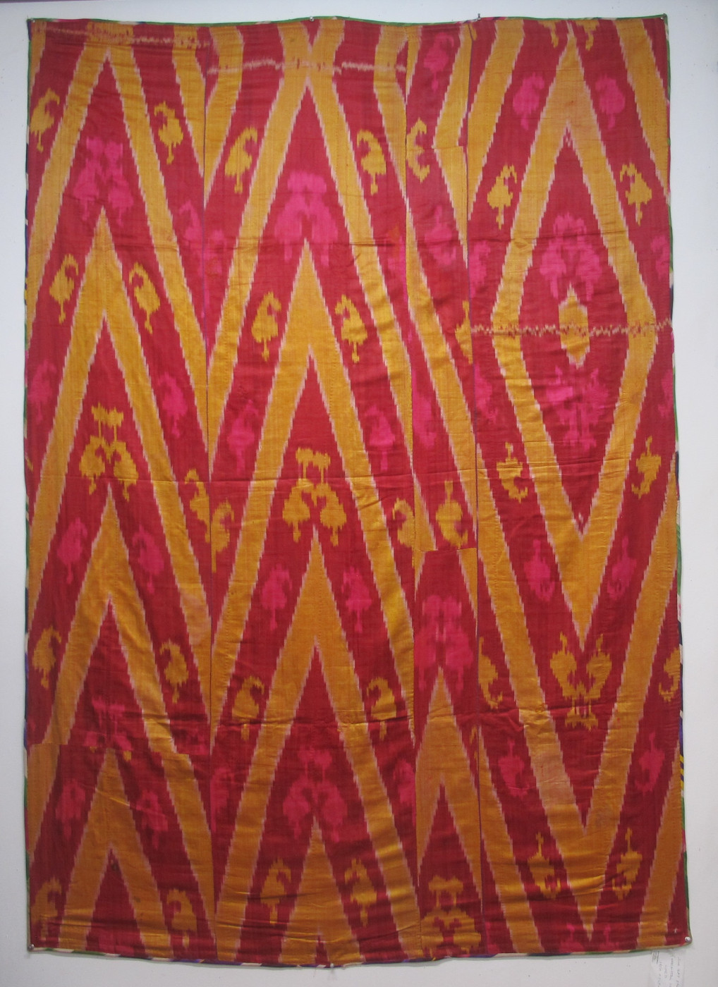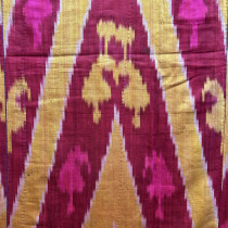 With silk warps and wefts, this striking ikat panel shimmers. Lovely combination of gold and magenta. Very nice condition. One or two minor light stains. Lined in a beautiful Russian chintz.