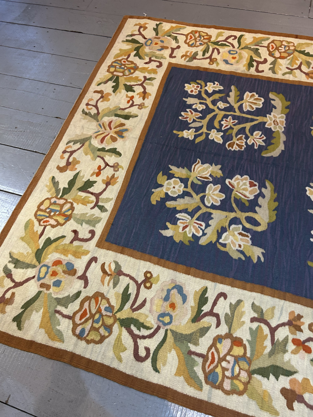 This striking piece from the Poltava district of Eastern Ukraine dates to the end of the 19th century. Ostensibly woven to be hung, the design is composed of a cluster of flowering shrubs in a vertical arrangement on a blue-gray field. The field colour is deliberately abrashed to give a sense of texture and depth. It is a dramatic composition with no secondary motifs to distract the viewer. The border is equally impressive. Generously proportioned, the repeating stylised palmettes and leaves on the abrashed pale blue background are quite stunning. Note too that there is a monogram in the bottom left corner of the border which suggests that this piece may have been made to order for someone important. Poltava kilims are often influenced by European decorative styles, but this piece is firmly in the Ukrainian folk tradition with a very pure drawing of the design. Furthermore the technique is exceptional. The weave is exceptionally fine, interlocking wefts have been employed to ensure a stable structure, and eccentric or 'curved' wefts appear throughout to add texture to the design. Cherished through the generations, this lovely piece is clean and in excellent condition.