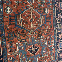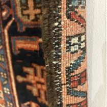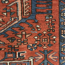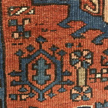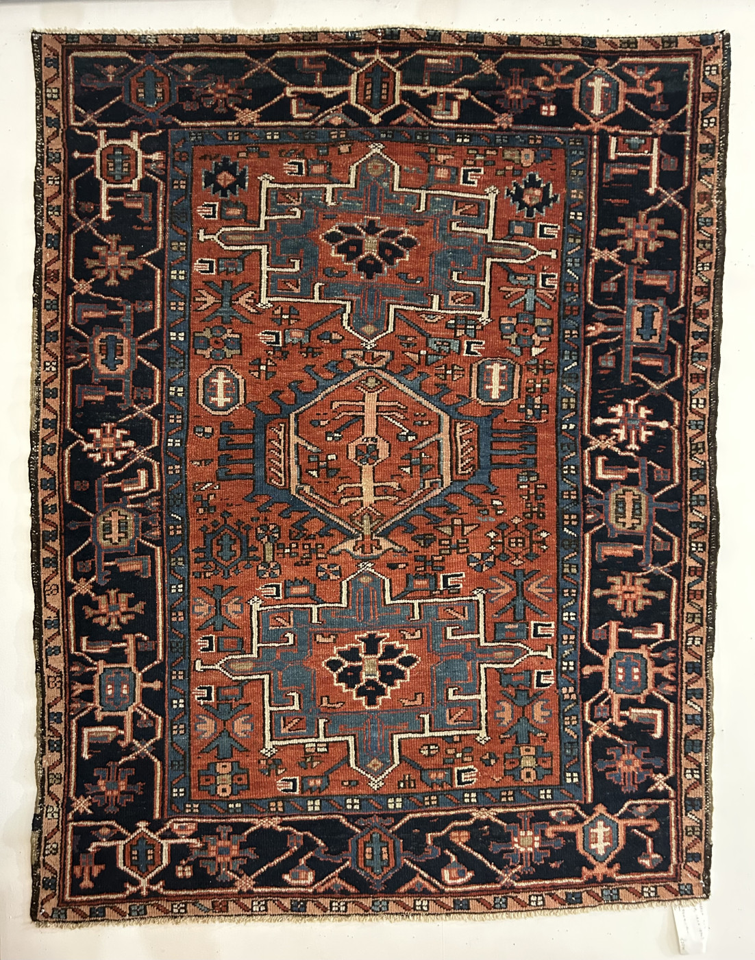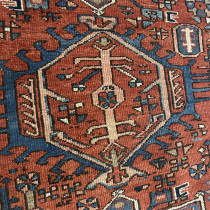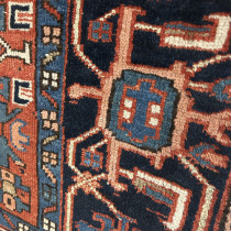 The technical characteristics of this charming village rug from North-West Persia, namely the single-wefted structure and flat back, suggest it was probably woven in the Karaja region. However, I feel that it may be a generation older than many Karaja rugs that we see today. The ubiquitous triple medallion format is archaically drawn, as are the scattered geometric motifs in the rest of the field. The sapphire blue main border fits well with the field design and confirms the opinion that this is a pre-commercial weaving. It is generously spaced, and repeating stylised palmettes and vines are archaically drawn and very eye-catching. This rug is the work of a master weaver who knew exactly what she was creating. The limited palette is composed of a few exceptional dyes, including the terracotta red, sapphire blue, pinks and pale blues. Professionally cleaned and in good condition this is a decorative and collective Persian village rug.