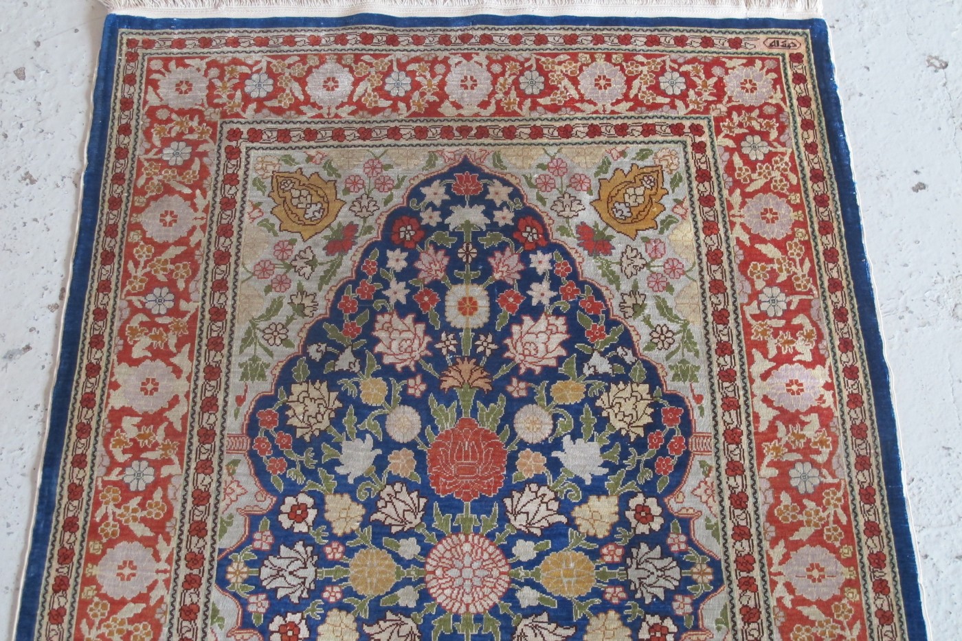 Not my usual thing, but I could not resist this little gem. Very finely knotted in silk with the most wonderful colours. The texture is sensational. It was produced in the Turkish city of Hereke by a master weaver. Note his signature in the top right hand corner. This rug has class and poise.