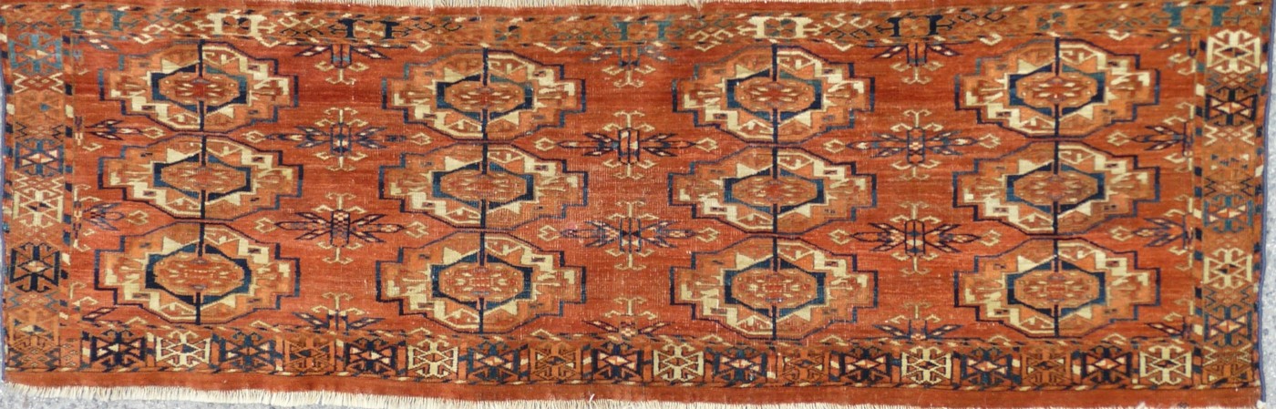 A fine example of the 12 gul tekke torba group. Fine velvety wool and great colour. gebnerally good condition with no repairs. Selvages replaced.