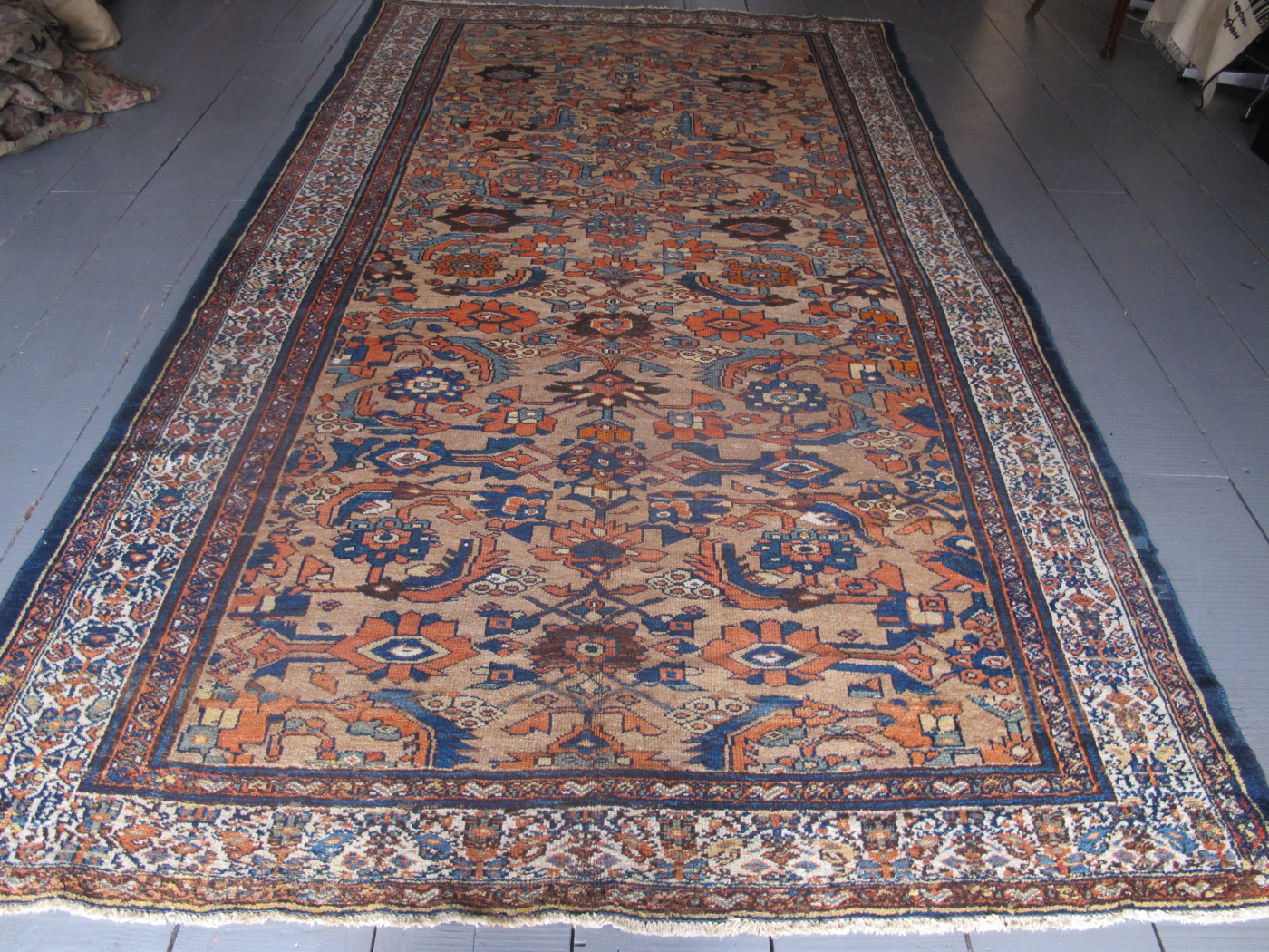 This is Hamadan carpet is an unusual size and with a nice camel background. The field design has a well-spaced Herati design. Nice soft colours and lived-in appearance. A decorative carpet ideal for a hallway or indeed any setting.
